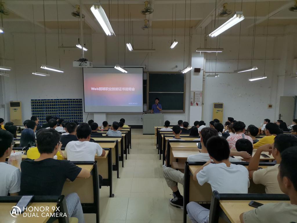 二是开展Web前端职业技能证书说明会。为了积极做好“1+X”证书制度试点工作的落地,我院于2019年10月11日在教学楼D107动员2017级和2018软件技术专业260余名学生参加“1+X”(WEB前端开发)动员会。在动员会上,软件技术专业负责人常贤发对“WEB前端开发”职业技能等级证书的由来从政策导向到证书的等级、要求、报名条件以及试点班具体实施过程进行了详细的讲解和解读。