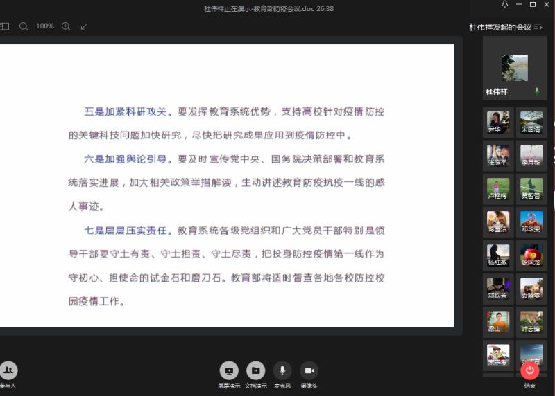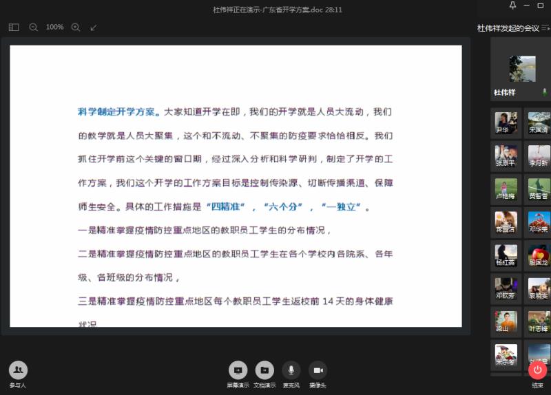 随后,杜伟祥同志传达了教育部有关防疫及教学工作的相关要求,要求所有党员同志保持战时状态,做到严防死守,明确“五个一律”,坚决防止疫情在校园蔓延。此外,他还传达了广东省开学方案的相关要求,为了控制传染源、切断传播渠道、保障师生安全,要自觉遵循“四个精准”,“六个分”,“一个独立”,要求党员同志带好头,在“停课不停学,停课不停教”的教学形式下,做到尽职尽责,克服教学资源不足等情况提高教学质量。