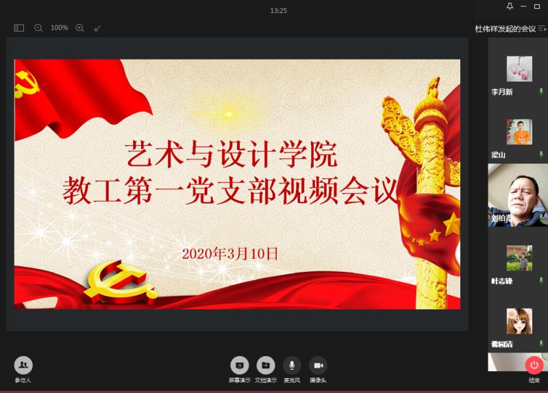 3月10日15:00,艺术与设计学院第一党支部召开“防疫防控”视频会议,支部所有党员同志参加视频会议,会议由党支部书记杜伟祥同志主持。