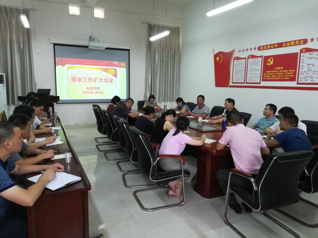 2020年7月9日,为全面落实党中央、国务院扎实做好“六保”“六稳”工作,扎实推进毕业学生就业率达到学校规定的最低要求,电信学院在学院会议室召开了就业工作扩大会议。学院班子成员、专业(教研室)主任、全体辅导员参加了此次会议,会议由徐国辉副书记主持。