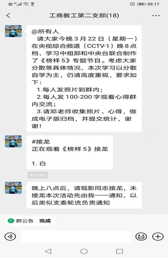 2021年3月23日晚,根据省委工委、市委组织部和学校关于收看中央组织部、中央电视台联合录制的专题节目《榜样5》的通知要求,工商管理学院党总支高度重视,安排部署各教师党员当晚各自在家收看该节目,学生党员统一在教学楼D204同步收看该节目,并要求教师党员以图片和接龙的方式在微信群内以示确认。观看该片后,党员同志们感受颇深,纷纷交流观后心得。