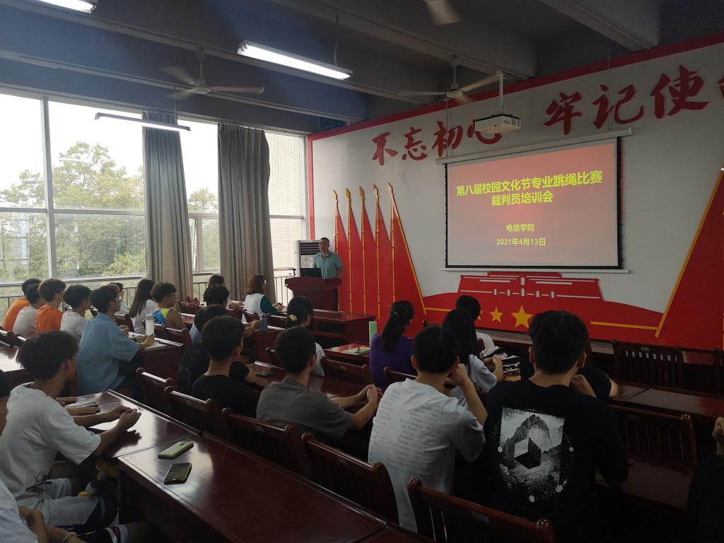 2021年4月13日,学院学生会体育部举行专业跳绳比赛“裁判员”培训会,杨日奎老师主讲