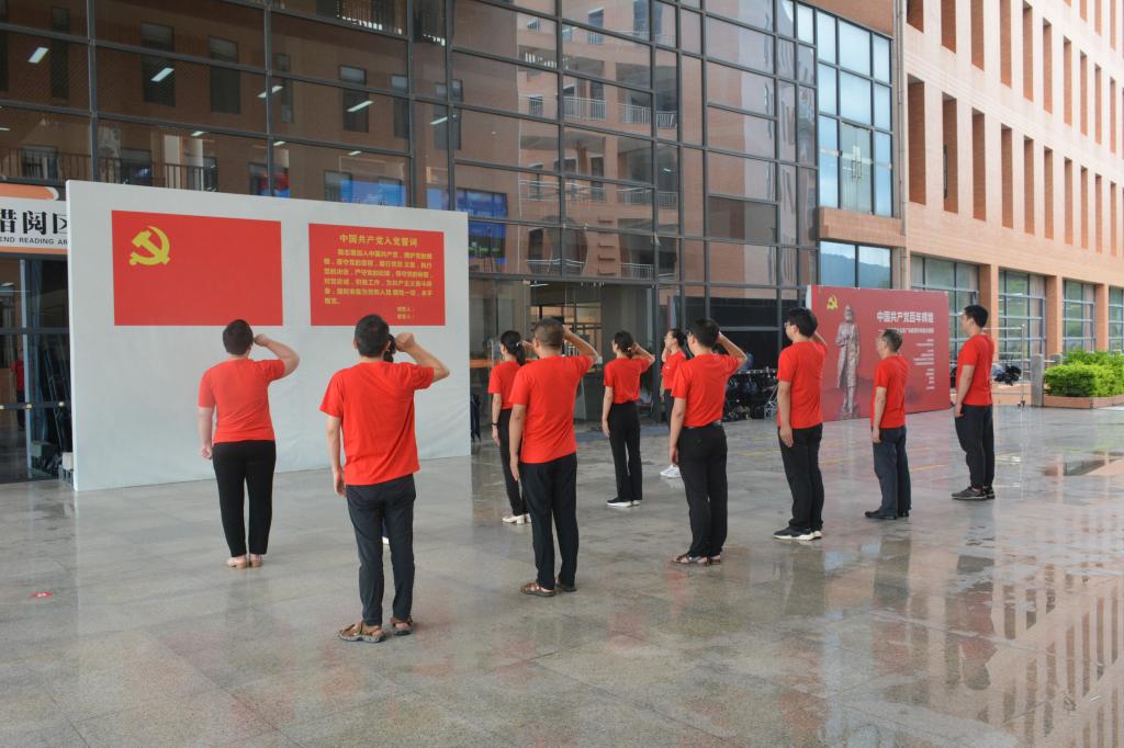 为进一步强化支部全体党员的责任感和使命感,支部组织全体党员在图书馆大厅前,面向党旗重温入党誓词,庄严许下全心全意为人民服务的铮铮誓言。