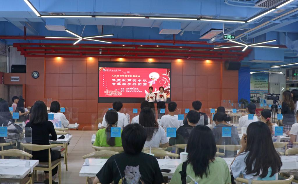 嘹亮歌声贺中秋,青春学子共团圆。9月21日,我校人文艺术学院团总支于第三饭堂举行中秋歌友会,活动由融媒体中心电视台黄晓纯、广播站刘佳洁主持。