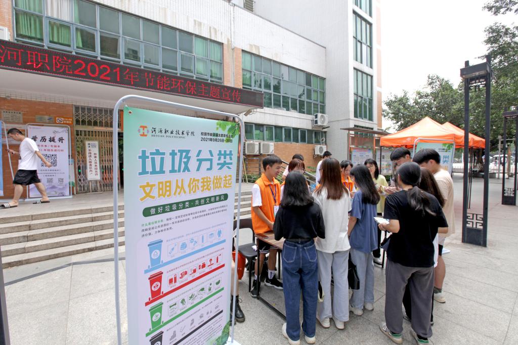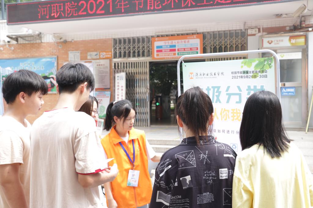 为了响应文明城市创建,提升学生节能环保意识,推动垃圾分类工作顺利开展,9月26日,我校在A区学生宿舍门口开展为期5天的创文垃圾分类主题教育活动。我校融媒体中心派出志愿者协助此次教育活动的开展。