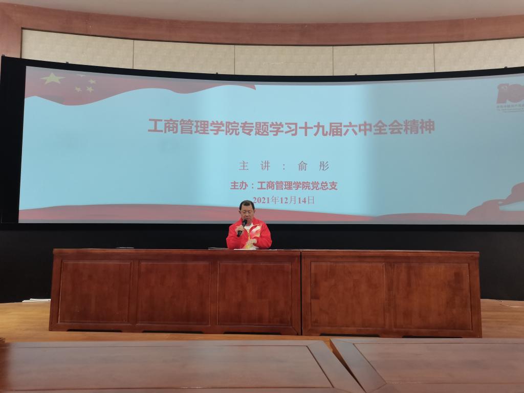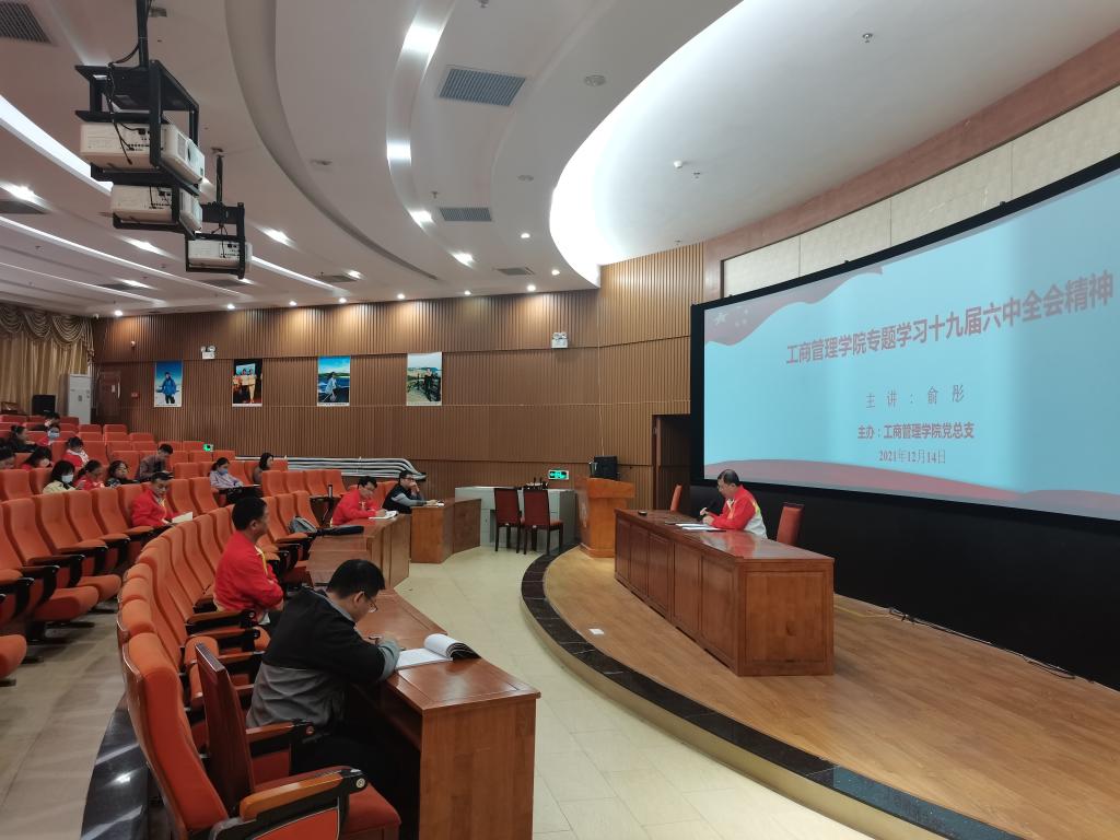 11月8日至11日,中国共产党第十九届中央委员会第六次全体会议在北京举行。这是在我们党百年华诞重要时刻,在“两个一百年”奋斗目标历史交汇关键节点上召开的一次重要会议。为了认真学习贯彻党的十九届六中全会精神,12月14下午工商管理学院学术交流中心一楼3D模拟实训室开展专题党课。党课由学院党总支书记俞彤同志主讲,学院全体教职员工参加。