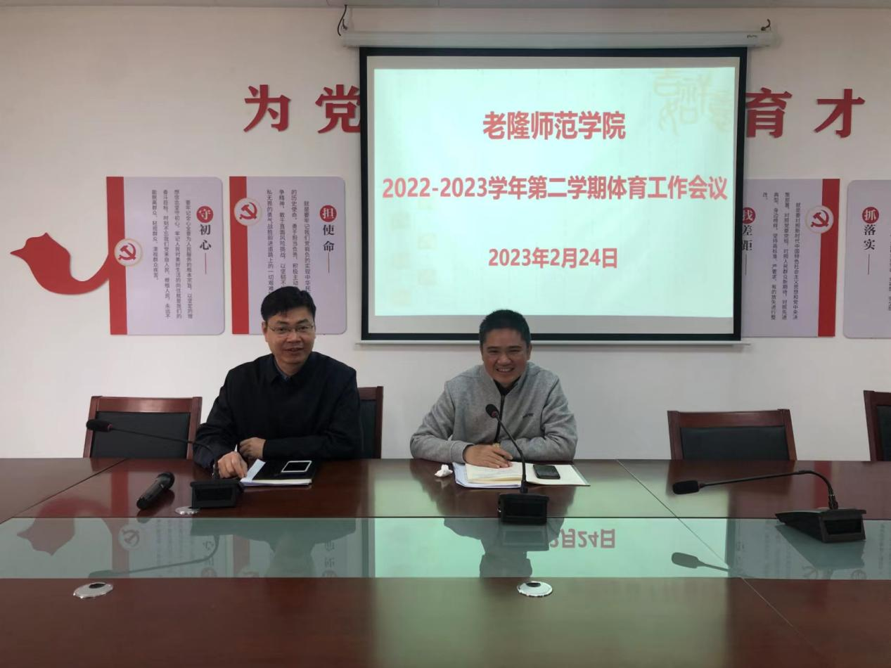 2月24日上午,老隆师范学院在艺术楼A201会议室召开2022-2023学年第二学期体育工作会议。袁光华副校长、老隆师范学院杜伟祥院长、李雄副院长及全体体育教师参加了此次会议。