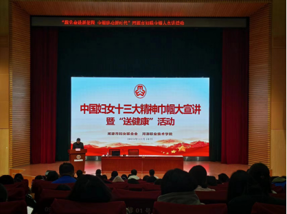 12月18日上午,由河源市妇联、必一手机登录入口主办,工商管理学院承办的“跟党奋进新征程 巾帼建功新时代”——中国妇女十三大精神巾帼大宣讲暨“送健康”活动在图书馆报告厅举行。河源市妇联宣传干部叶芷欣,二十大党代表、中国妇女十三大代表、龙川威达绝缘材料有限公司党支部书记、工会主席、妇联主席黄东云,中国妇女十三大代表、东源县漳溪畲族乡党委副书记、乡长蓝伟先,青少年心理健康知识讲师、主任记者、国家二级心理咨询师、国家中级社工师、高级感统培训师余智红,河源市委党校党员教育师资库优秀讲师、河源市点创融湾文化服务有限公司党支部委员会书记陈浩山,工商管理学院团委书记李志宇、校企办主任曾惠华,以及300多名女学生代表参加活动。
