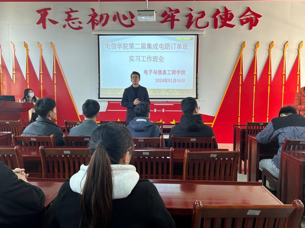 2024年1月4日,为了确保“集成电路订单班”实习工作的顺利开展,我院在实训楼B306教室举行第二届“集成电路订单班”实习工作班会。会议邀请了即将去实习的企业代表来校讲解,周永福副院长、电信学院2024届各专业“集成电路订单班”报名的毕业生参加了本次实习工作班会,会议由贺小艳老师主持。