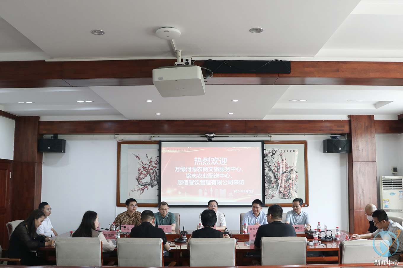 4月2日,我校于第一会议室开展万绿河源农商文旅服务中心、铭志农业配送中心、厨信餐饮管理有限公司产学研合作洽谈。万绿河源农商文旅服务中心董事长陈健萍、万绿河源农商文旅服务中心项目负责人黄彪、万绿河源农商文旅服务中心电商负责人刘晓婷、铭志农业配送中心负责人何华强、厨信餐饮管理有限公司行政总厨李文斌,我校党委书记韦荣、副校长袁光华、科研处处长廖远兵、工商管理学院院长俞彤、工会办公室主任叶初标及相关专业主任参加会议。本次会议由科研处主办,袁光华副校长主持。