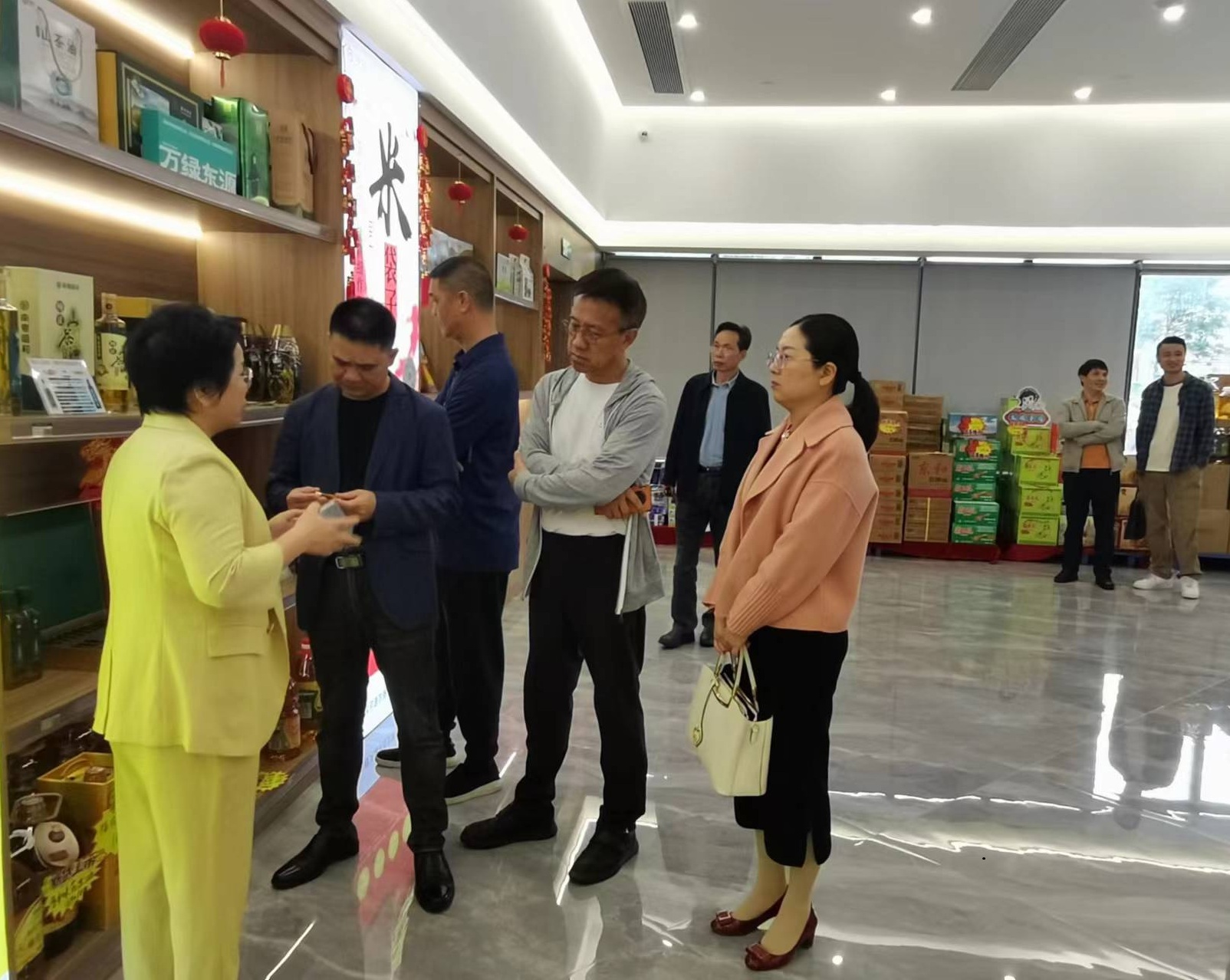 参观万绿河源农商文旅服务中心产品展销区