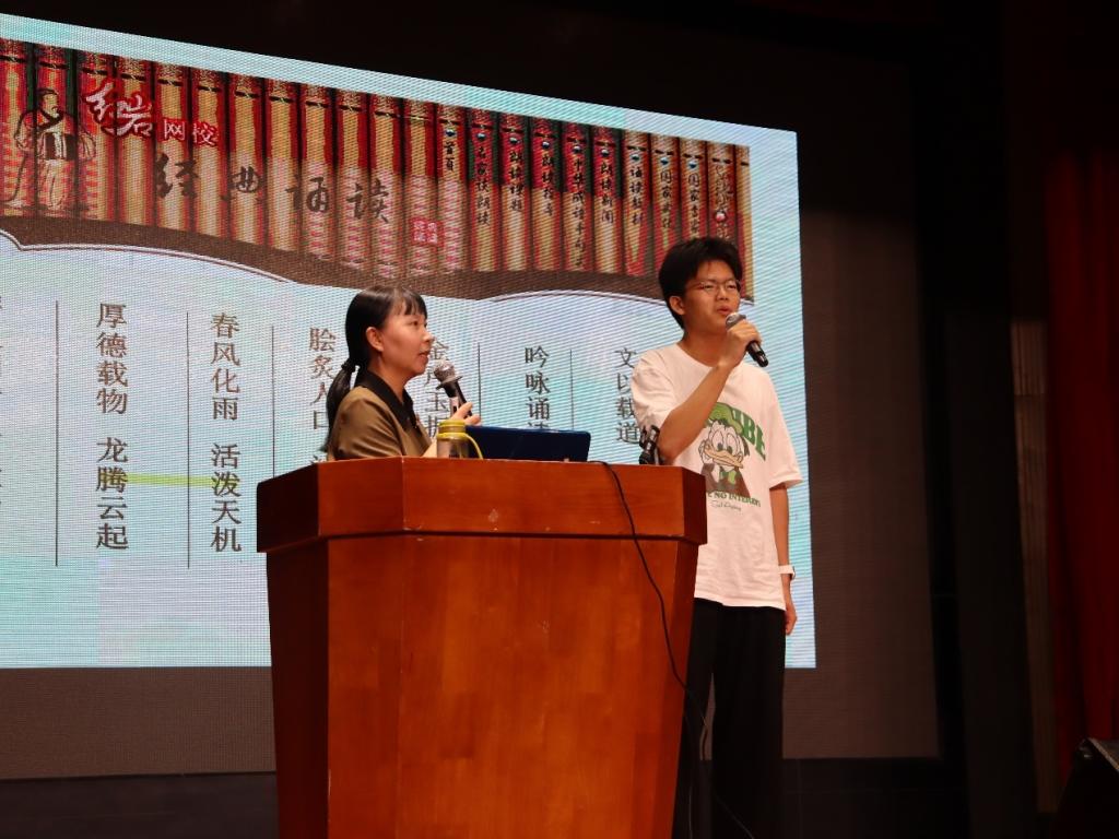 随后,郑尔君老师详细讲解了共鸣控制训练和声音的特性,引导学生如何更好地运用自己的声音进行朗诵。她现场示范了胸腹联合呼吸法、强控制练习和弱控制练习等技巧,并鼓励学生积极参与练习,感受声音的变化和魅力。接着,郑尔君老师用一曲《念奴娇》作为引导,让学生们亲身感受发声气息的运用和词中的抑扬顿挫。她饱含深情的朗诵,赢得了现场师生的阵阵掌声。