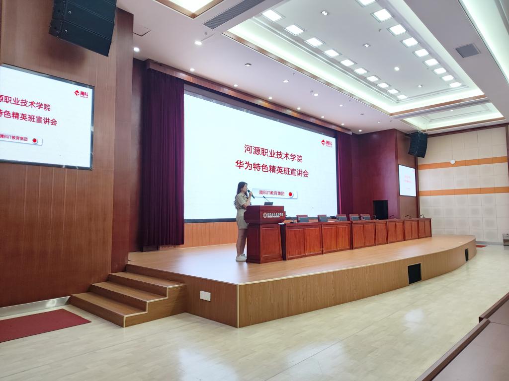 广州腾科网络技术有限公司罗经理随后为各位同学详细介绍了华为特色精英班的班级设置,她从企业实力、学习内容、就业服务和选拔方式等方面进行深入讲解。