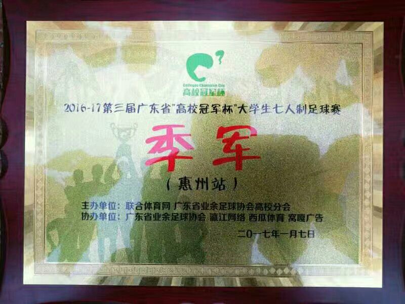 2017年1月7日下午,第3届高校冠军杯巡回积分赛第四站(惠州站)在惠州学院体育场圆满落幕。广州体育职业技术学院点胜东道主惠州学院夺得桂冠,我校以2-0击败广东财经大学华商学院获得季军。广州体育职业技术学院陈学政荣膺MVP,我校邓威获得最佳射手。