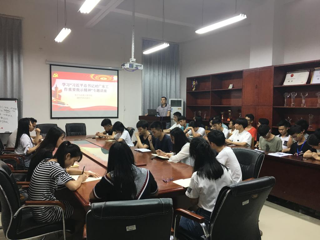 2017年5月22日晚,电信学院团总支在实训楼A208开展学习“习近平总书记对广东工作重要批示精神”专题讲座。参加人员有第十届团总支学生会副部长以上人员、15、16级班委组织委员。讲座由团总支书记杨日奎主讲。