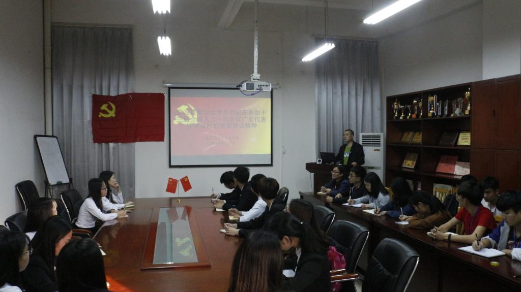 2018年4月17日,电信学院学生党支部在实训楼A208组织学生党员开展“学习贯彻习近平总书记在参加十三届全国人大一次会议广东代表团审议时的重要讲话精神”专题学习活动。参加活动的有电信学院学生党支部学生党员、17级组织部委员、纪检委员,学生支部宣传、纪检委员杨日奎老师主讲。