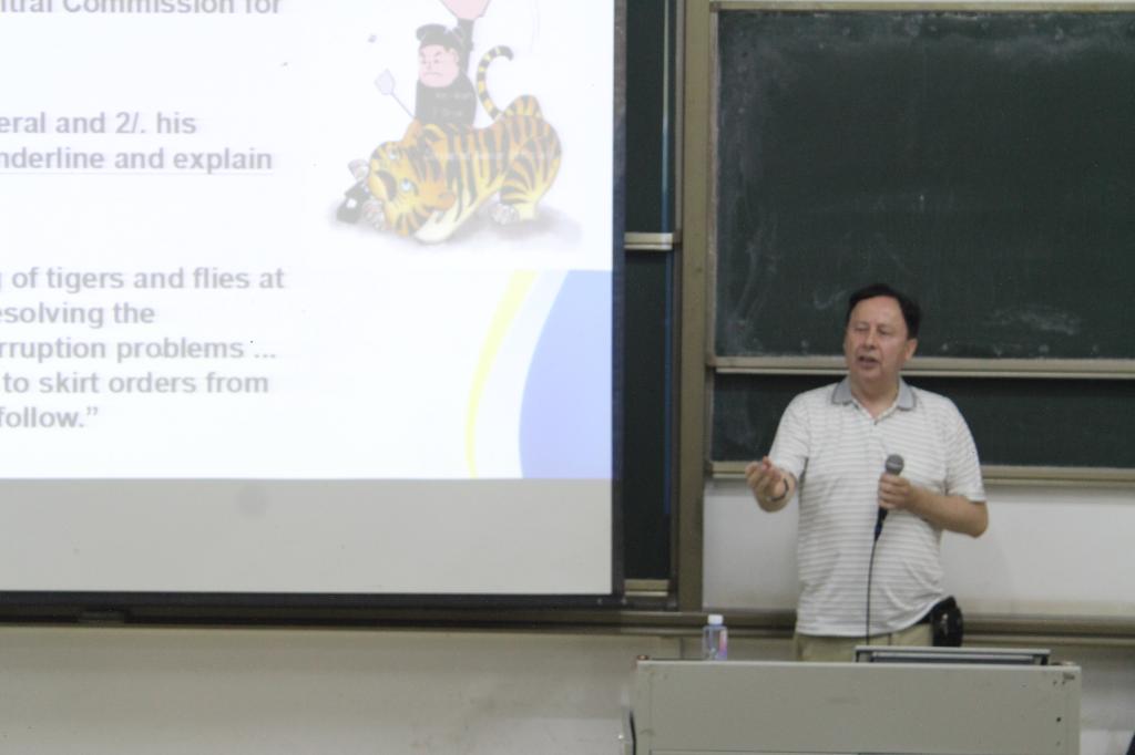 Salter教授的讲座首先通过中国当前英语新闻中常出现的表达方式来分析隐喻的用法,如“打虎”、“灭蝇”,“摸着石头过河”,通过解释和区分字面意思和隐含意,进一步分析了英语语言中隐喻的修辞用法。代表性的如:heart(心),water(水),hand(手)在隐喻中的灵活运用。