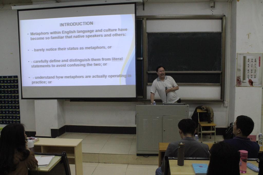 4月24日晚7点半,河源市科协翻译工作者协会和英语教育专业在必一手机登录入口教学楼D107联合举办了题为“The Importance of Metaphor in English Language and Culture”(隐喻在英语语言与文化中的重要性)的讲座,讲座特邀英国教授Michael Geoffrey Salter前来主讲。