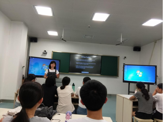 黄老师向同学们引进了American Southern Renaissance这一概念,对William Faulkner及其所在的时代进行了一个介绍,然后通过对故事plot进行设问,考察同学们对故事的大致内容的了解程度。