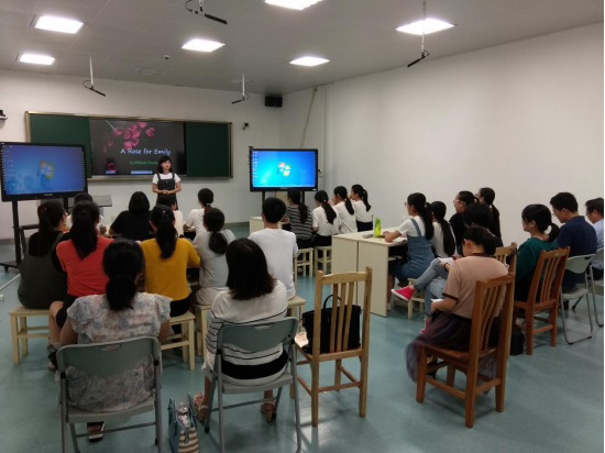 黄老师上的课程是《英美文学》,教学内容是“A Rose for Emily”,黄老师的授课采用全英文开展,同学们反映热烈,积极配合老师回答问题,课堂互动效果很好。