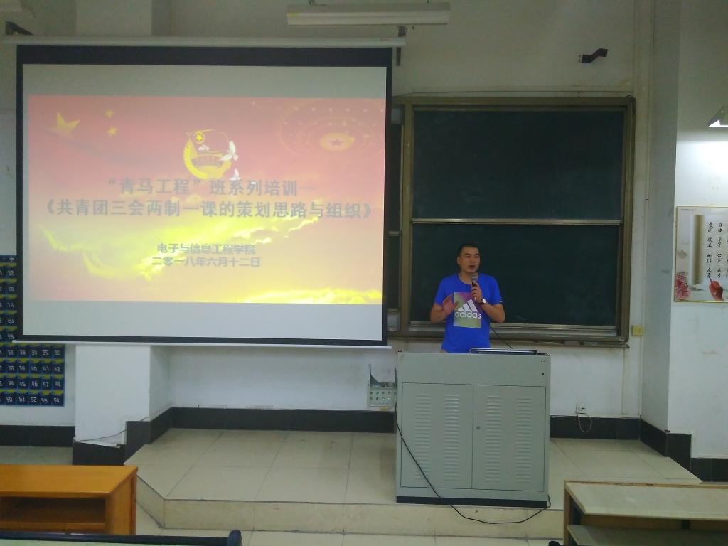 2018年6月12日下午,电信学院在教学楼D208举行第十一届团总支学生会学生干部“青马工程”班系列培训专题讲座之共青团三会两制一课的策划思路与组织。参加培训的人员有电信学院第十一届团总支学生会全体干部、各专业团支部成员、励志团体分团全体成员、各协会正副会长、16级团支部书记、17级各班班长、团支部书记、组织委员。团总支书记杨日奎老师担任主讲。