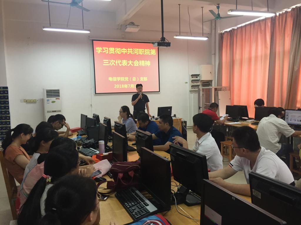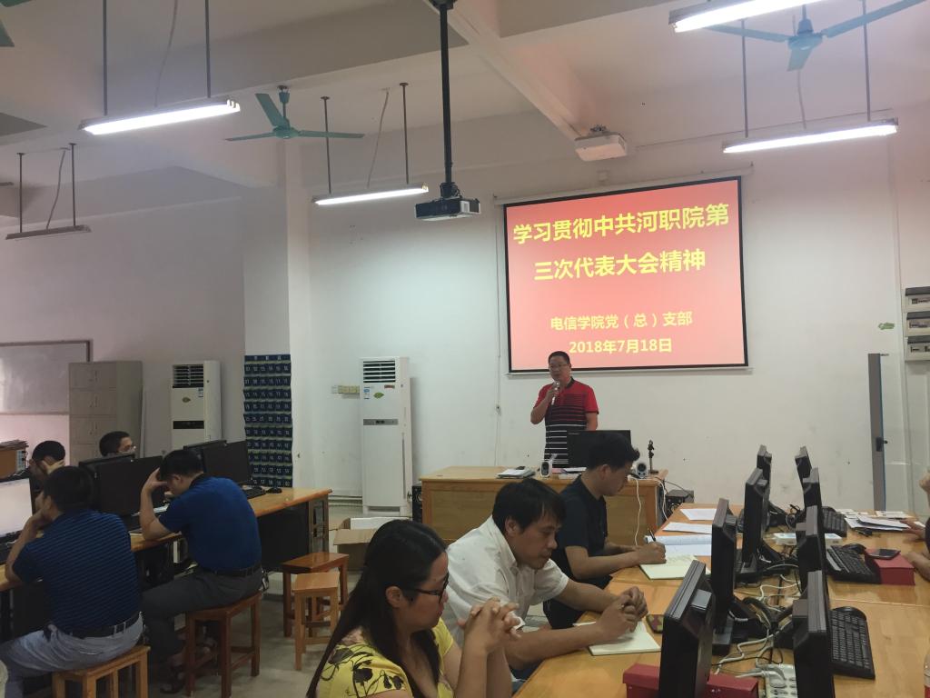 2018年7月18日下午,我院在实训楼A213召开学习贯彻中国共产党必一手机登录入口第三次代表大会精神会议,学院全体教职工参加了本次会议,由学院副书记徐国辉主持。